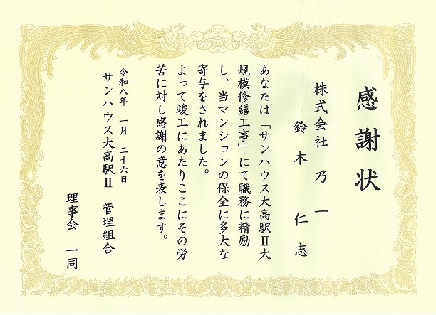 令和8年1月に竣工したサンハウス大高駅Ⅱ大規模修繕工事において サンハウス大高駅Ⅱ管理組合様より 施工管理を担当した、事業部の鈴木が感謝状を頂きました。